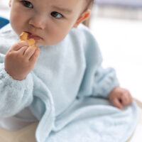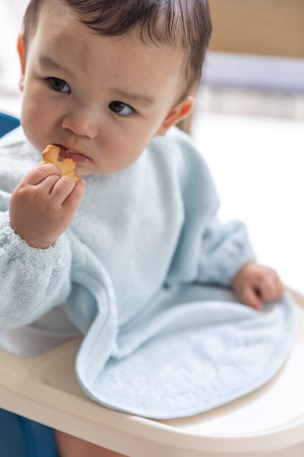 El babero con mangas y puños elásticos de Timboo está diseñado para ofrecer una protección aún mayor durante las comidas o actividades.