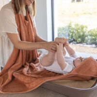 La capa delantal de Timboo es ideal para envolver a tu bebé cómodamente y protegerlo después del baño, con un diseño práctico y respetuoso con el medio ambiente.