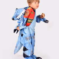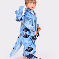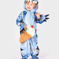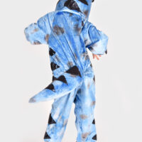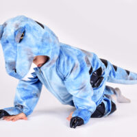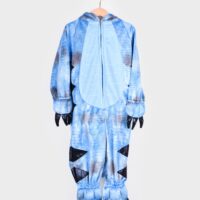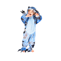 El disfraz es un mono completo de felpa en color azul con detalles en azul metalizado. Incluye capucha de dinosaurio y cola acolchada cosidas al mono. En los puños de las manos y de los pies tiene garras acolchadas cosidas. El mono se cierra gracias a la cremallera que tiene en la parte delantera. Fabricado con 100% poliéster.